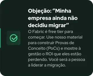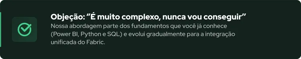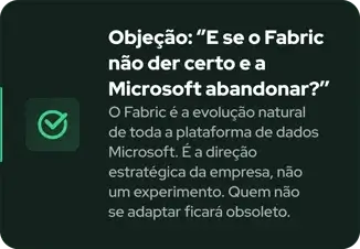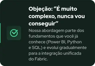 Perfeito para analistas, engenheiros ou arquitetos de dados que querem evoluir e dominar tecnologias integradas modernas e entender como funciona cada workload dentro da plataforma Fabric.
